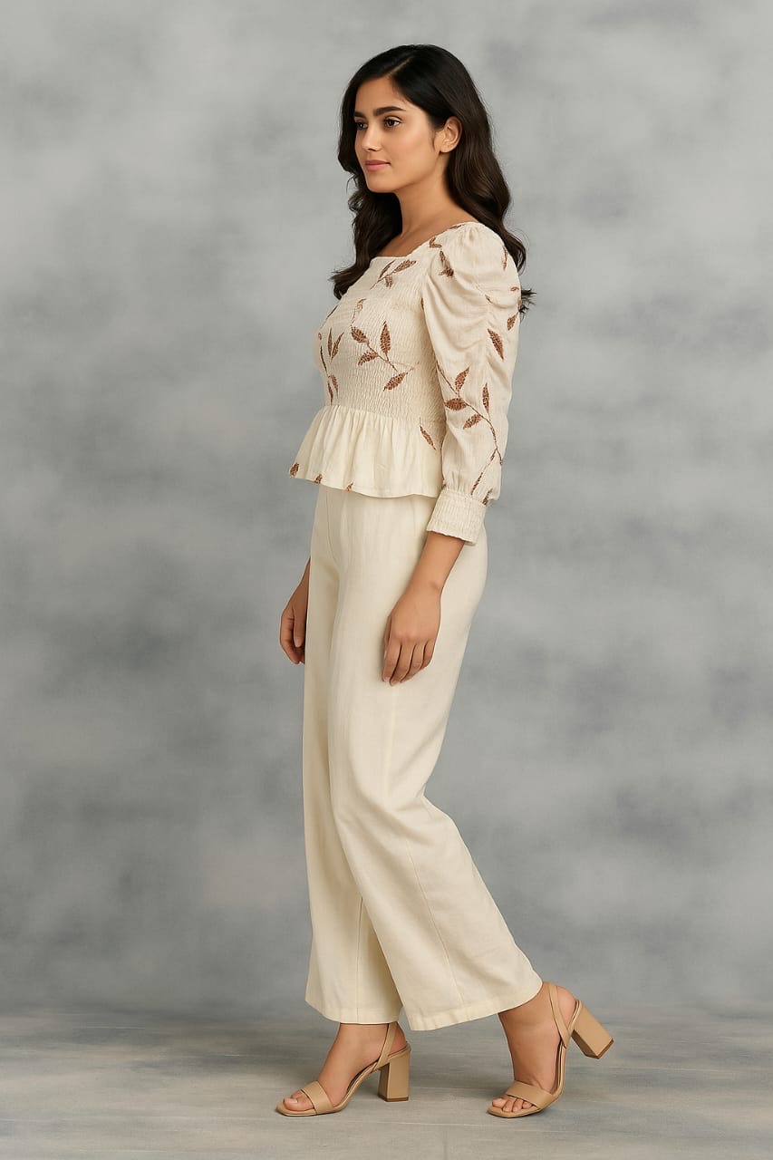Elevate your everyday look with this elegant beige cord set featuring a smocked peplum top and wide-leg trousers. The top comes with intricate brown leaf embroidery and stylish ruched sleeves that add a touch of sophistication. Designed for comfort and style, this coordinated set is perfect for casual outings, brunch dates, or office chic. Pair it with nude heels or flats for a complete look.